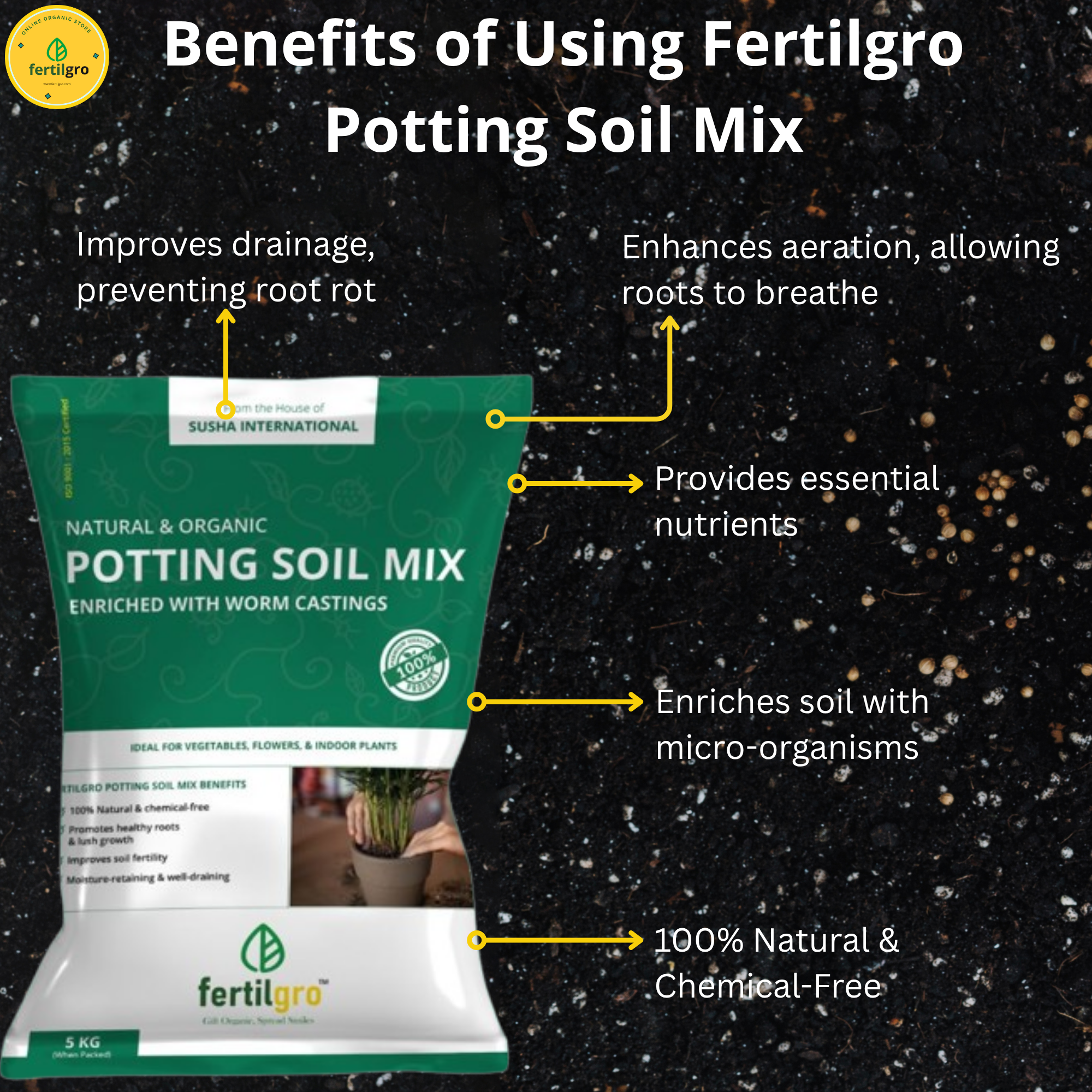 Fertilgro Potting Soil Mix is a high-quality, nutrient-rich soil blend designed to provide optimal growing conditions for a wide variety of plants, including houseplants, vegetables, herbs, and flowers. This potting mix is typically formulated with a balanced combination of Vermicompost, Perlite, Cocopeat, Neem cake, Epsom Salt, and other valuable micronutrients to ensure proper aeration, drainage, and moisture retention, which are essential for healthy root development and plant growth.